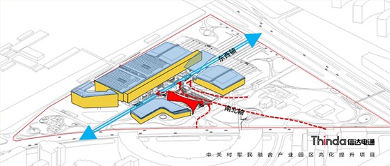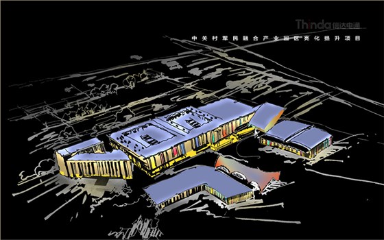 中關村軍民融合產業園區的亮化設計主要以建筑燈光為主體設計方向,用燈光的形式突出建筑結構特點,突出時尚、創新、科技、新潮的融合產業園。園區建筑結構整體簡潔、大氣,信達電通利用光影效果及景觀元素,打造東西、南北軸向的建筑縱身層次,整體以各種幾何形體組合而成,燈光在設計的同時尊重建筑本身的理念,優化夜景氛圍,通過塊與面的結合,塑造一個大氣魄、大追求的文化產業新品牌。