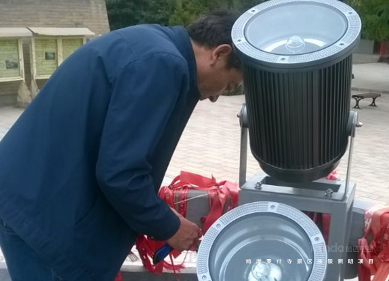 照明施工人員對燈具進行保護處理。