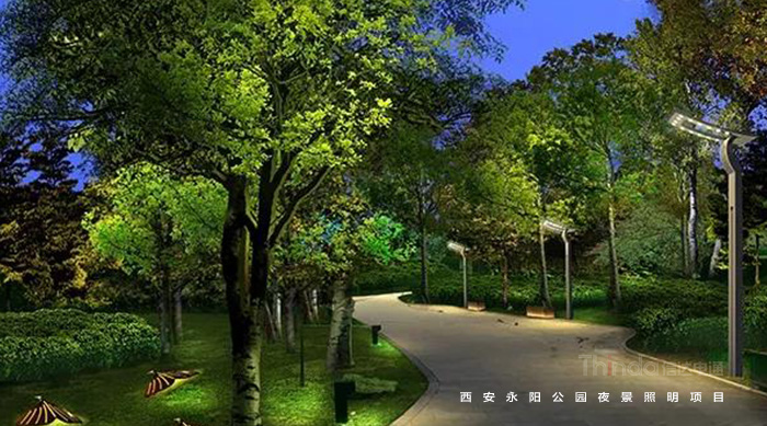 永陽公園在照明設備與器材上應用先進技術、先進光源,照明設計以人為本、照度合理,園區燈具的選擇在造型上與環境協調一致,而且造型新穎,玩味十足。通過不同手法,園區的山、水、路、林各色景致在夜間一一凸顯。
